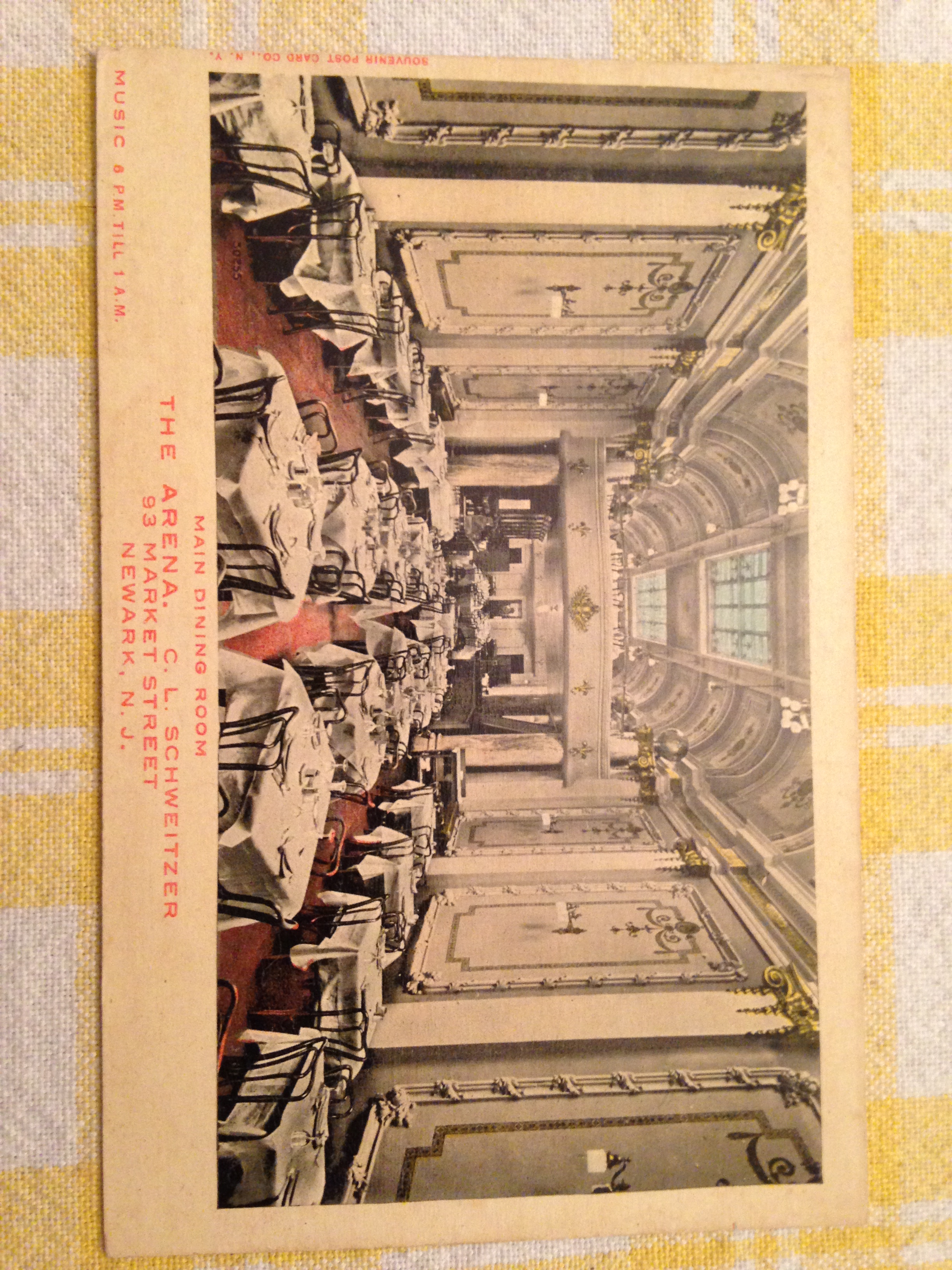 July 13, 2015May 5, 2021 The Arena C.L. Schweitzer, prop. This magnificent restaurant was located at 93 Market Street, Newark,NJ. For your entertainment and dining pleasure there was live music from 8 P.M to 1 A.M. Share this: Click to share on X (Opens in new window) X Click to share on Facebook (Opens in new window) Facebook Like Loading...