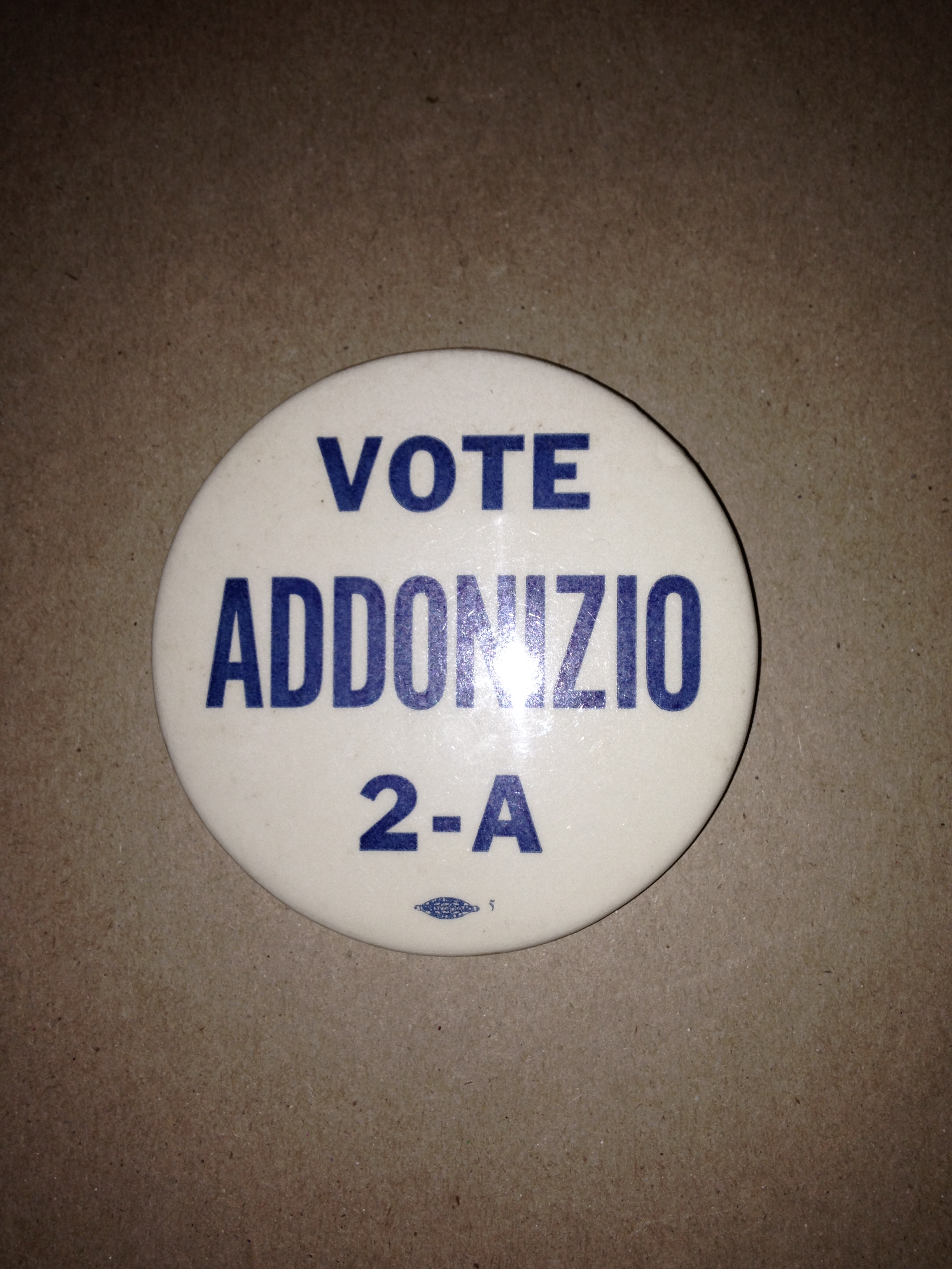 Hugh Joseph Addonizio was an Italian- American Democratic Party politician, who was the 33rd mayor of Newark, New Jersey, from 1962 to 1970, and a U.S. Congressman for 13 years prior to that. These are two of his campaign buttons.