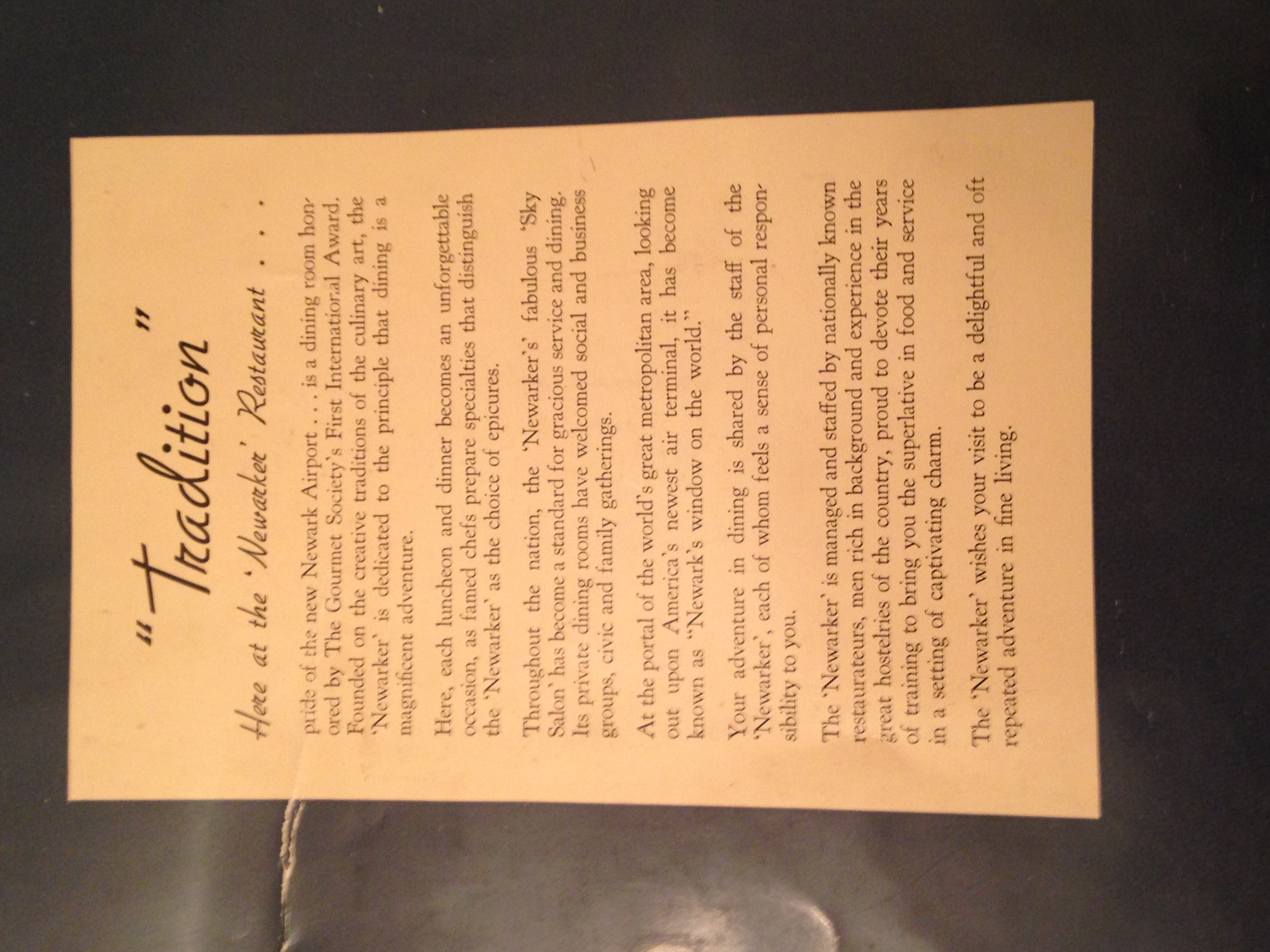 I will use excerpts from an article in The New York Herald Tribune on Saturday, March 13, 1954 to give a first hand account of this unique and trend setting restaurant. I found this article tucked in the menu pictured above which is from the first year of the Newarker.. The reporter arrived at the Newarker via helicopter from La Guardia Airport in New York. “We are landing now, this is the Newark Airport, destination the Newarker, one of the finest of New Jersey restaurants. Their are plenty of other ways to get there, of course, but for real adventure go by helicopter. Soon you may ! A dinner flight is being scheduled to arrive around 7:30. In the beginning not so handy, but something to do at least once in a springtime. The take-off will be from La Guardia to include Idlewild (now Kennedy) , then to Newark. Imagine that trip at the sunset hour !