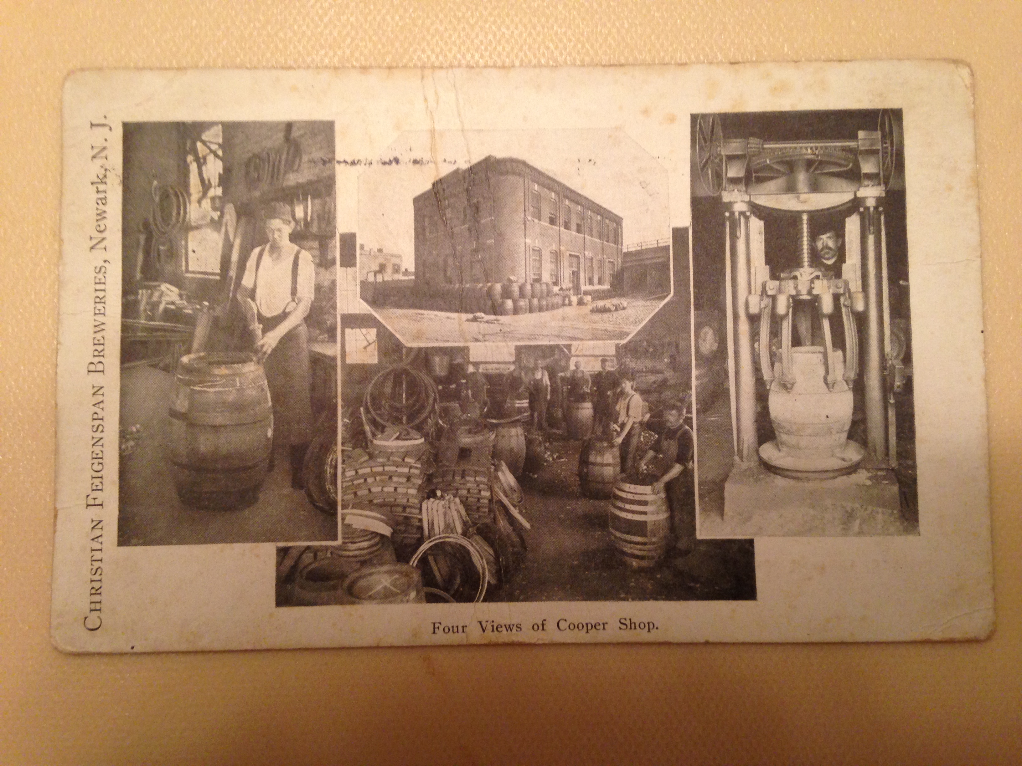 This post card depicts the cooper shop of the Feigenspan P.O.N. (Pride of Newark) Brewery. Cooper shops were where the wooden beer barrels were made. I own a wooden keg from the Krueger Brewing Co. and believe me it has far more charm than an aluminum keg. Every brewery had a cooper shop. What is of particular interest to me is the fact that they depicted the barrel making process at all. While this seems very interesting to modern eyes the breweries typically didn’t show such mundane functions to the public. It’s sort of like giving attention to the box and not the pizza.