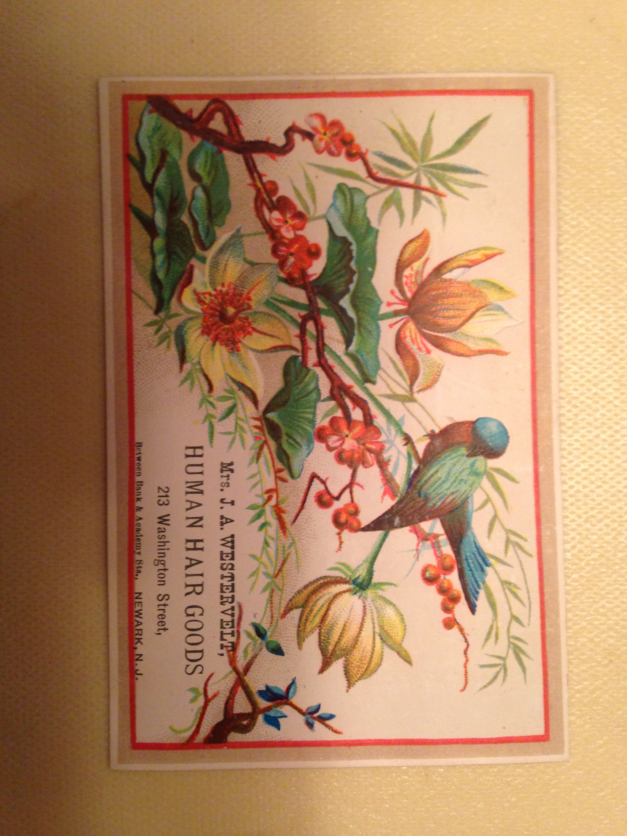 July 25, 2015May 5, 2021 Trade Card-Mrs. J.A. Westervelt Human Hair Goods Another beautiful trade card. I wonder if Mrs. Westervelt’s human hair goods were as expensive as the hair goods found downtown today? Share this: Click to share on X (Opens in new window) X Click to share on Facebook (Opens in new window) Facebook Like Loading...