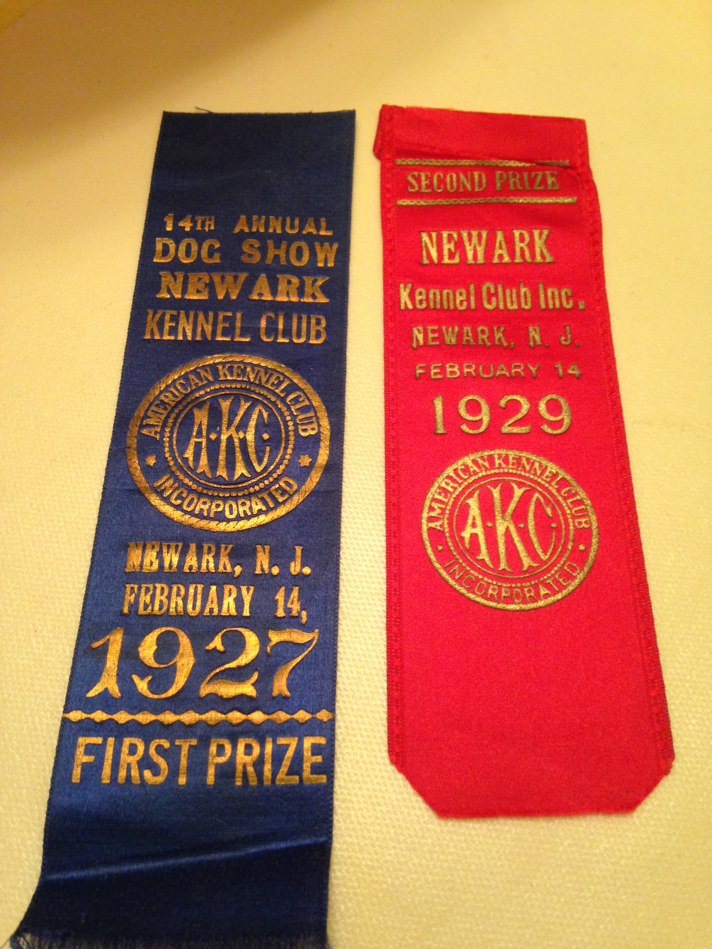 The Newark Kennel Club was founded in 1912. The first dog show in which they were involved was in 1913. The club was sanctioned by the American Kennel Club. I would welcome any additional information that someone may have. These ribbons represent a first and second prize winner. They are two of a lot of four that I purchased.