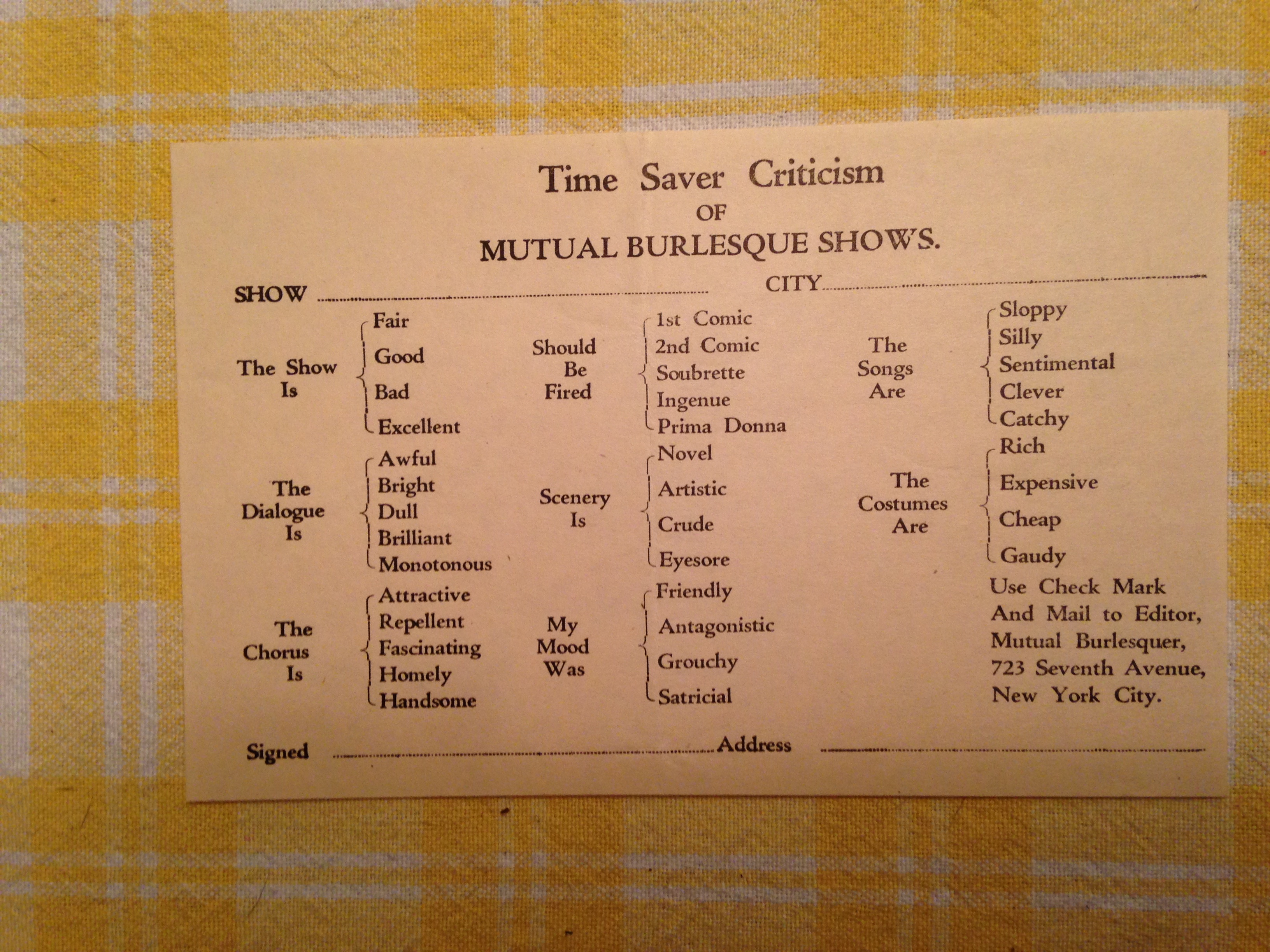 The Mutual Burlesque program included in this blog was from the week of October 14th ,1928. As one can see, the program was extensive and judging from the advertisers- not very scandalous. The program contained a questionnaire for patron’s opinions on the show. Amazingly, the questionnaire