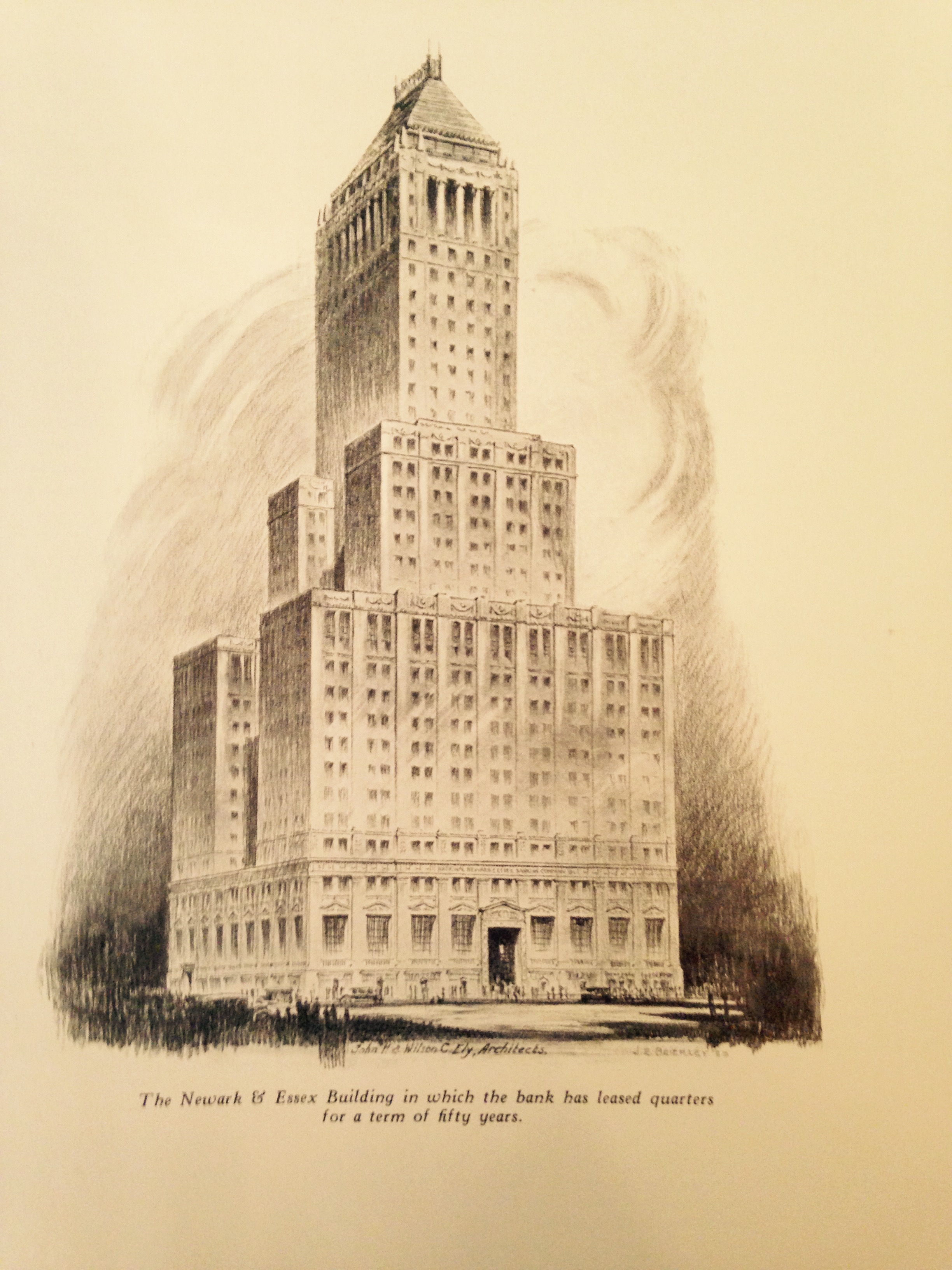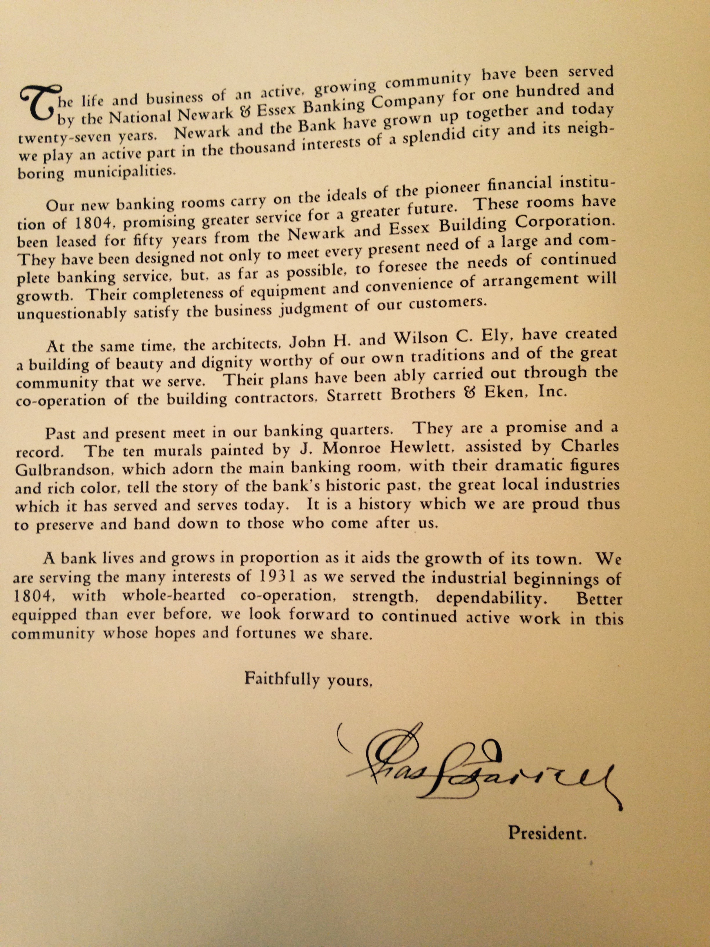 In 1931, to commemorate the opening of the National Newark and Essex Banking Company’s new Art Deco tower they published a booklet. Designed by the renowned architects, John H. and Wilson C. Ely, 744 Broad Street heralded the success of the bank, which had been founded in 1804. The main banking floor, which was located on the mezzanine level, was accessed by a grand marble staircase. The banking floor was adorned with 10 murals by J. Monroe Hewitt, assisted by Charles Gulbrandson, which told the story of bank’s historic past and Newark’s great industries. The building was a beacon of hope for a country slipping ever deeper into the Great Depression. I’ll let the booklet tell its own story.