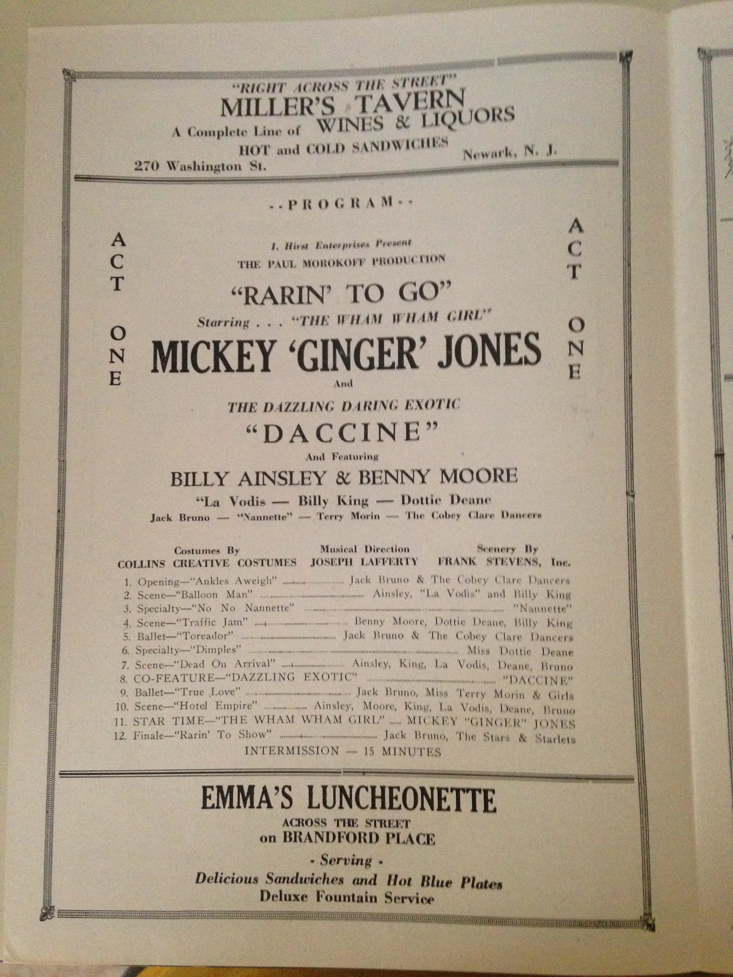 A previous blog discussed Minsky’s Burlesque at the Adam’s Theater. This program from January 18th, 1957 is for the Empire Theater their main competitor. Quite tame by today’s standards – it was quite risqué in 1957. In February of 1957 Minsky’s Burlesque closed at the Adams. Shortly thereafter The Empire Burlesque would follow. Outlawed and no longer acceptable, the City of Newark brought down the final curtain.