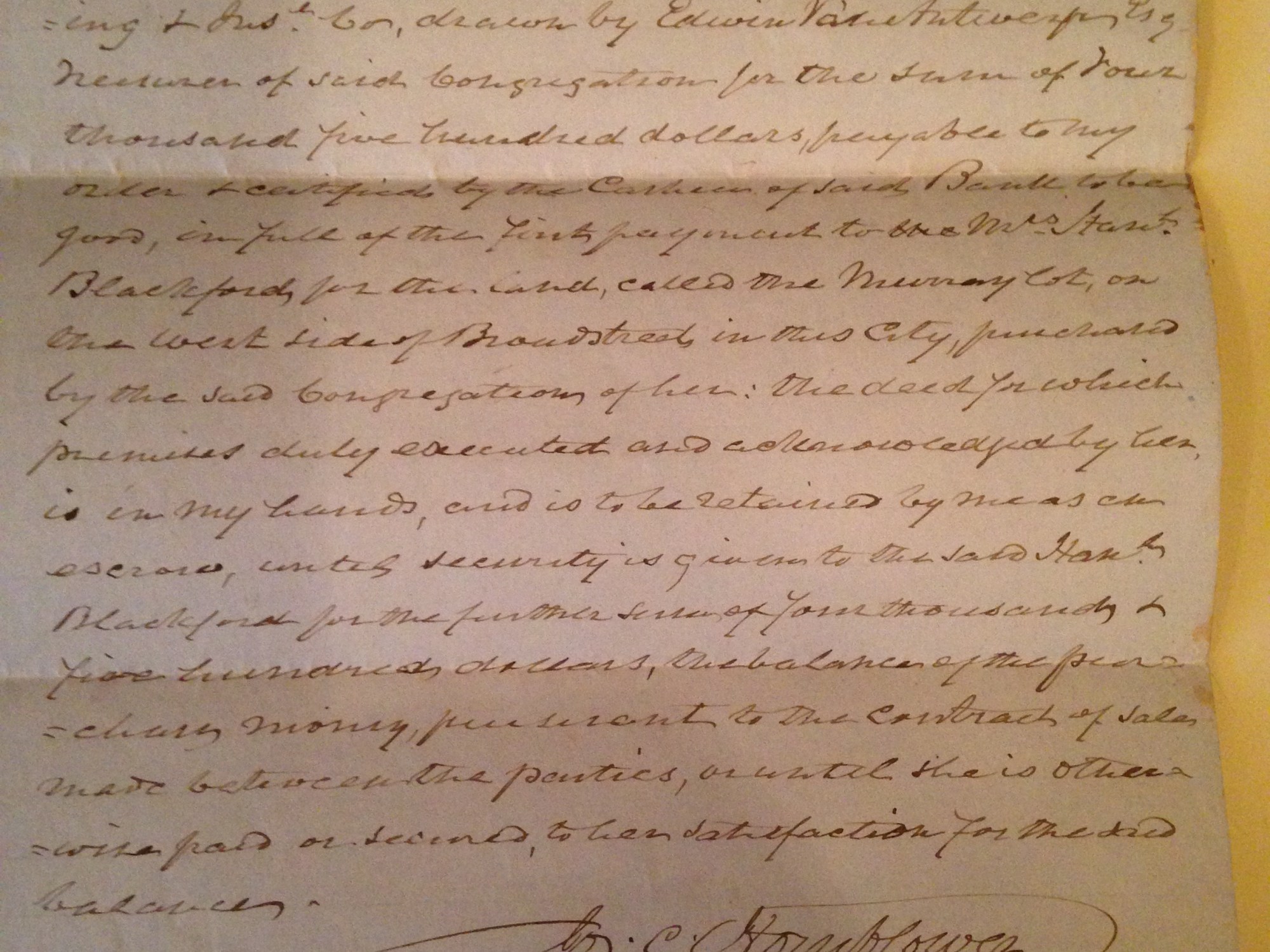 The document, in this blog, is a receipt dated April 2, 1849, for the purchase of a lot situated on what came to be called West Park Street. The receipt is signed by Joseph C. Hornblower, who according to the 1836-37 Pierson’s City Directory, was Chief Justice, 6 Park Place.