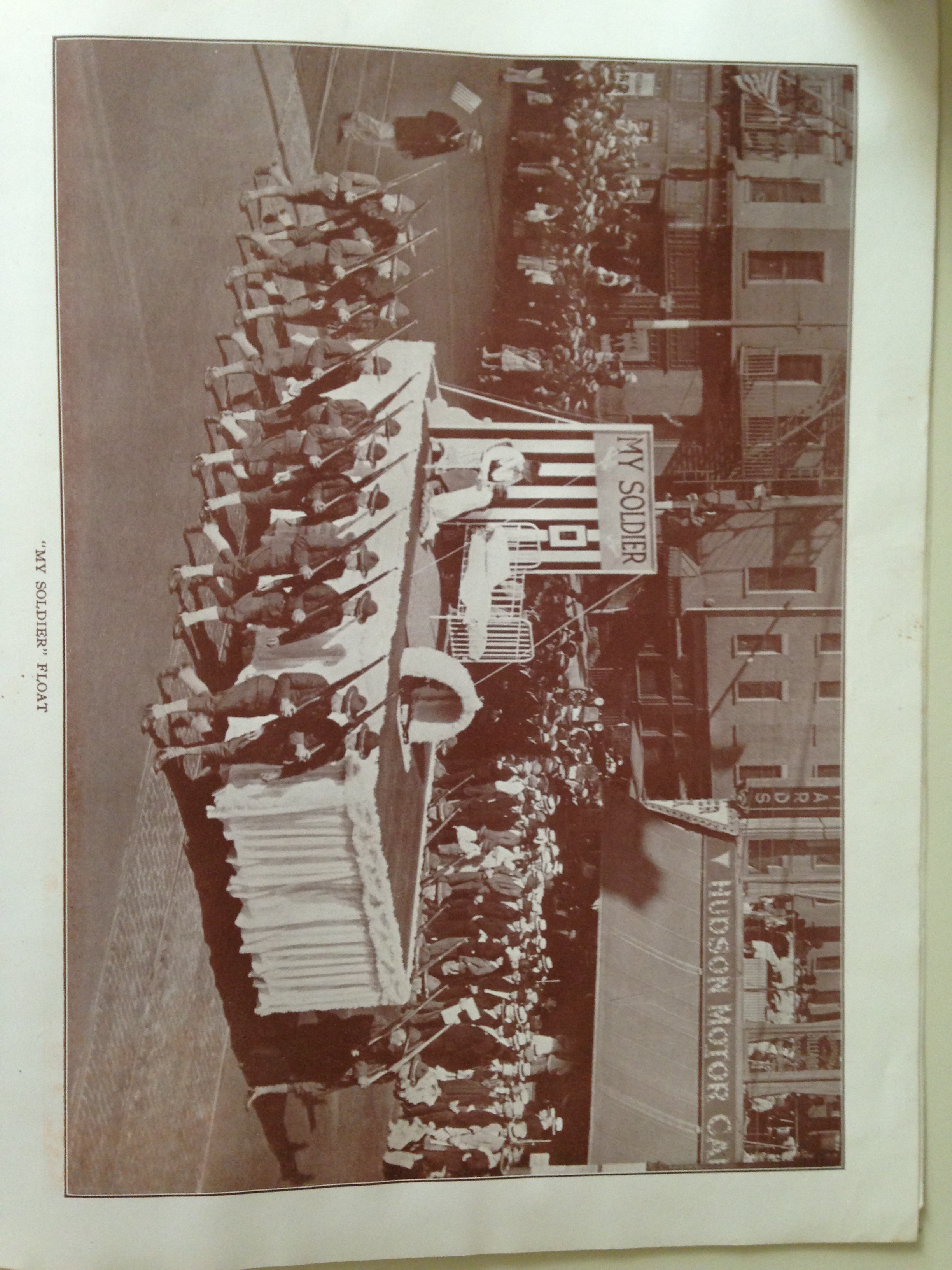 The second float was “My Soldier- a Prayer for His Safe Return”. It represented a child’s bedroom, the back of the small bed was against a partition which had the picture of a soldier. A young mother is seated with a child kneeling beside her in the act of saying ” Now I lay me”… and a prayer for the safe return of his “Daddy”. This float had an honor guard of twenty-four soldiers from Camp Dix.