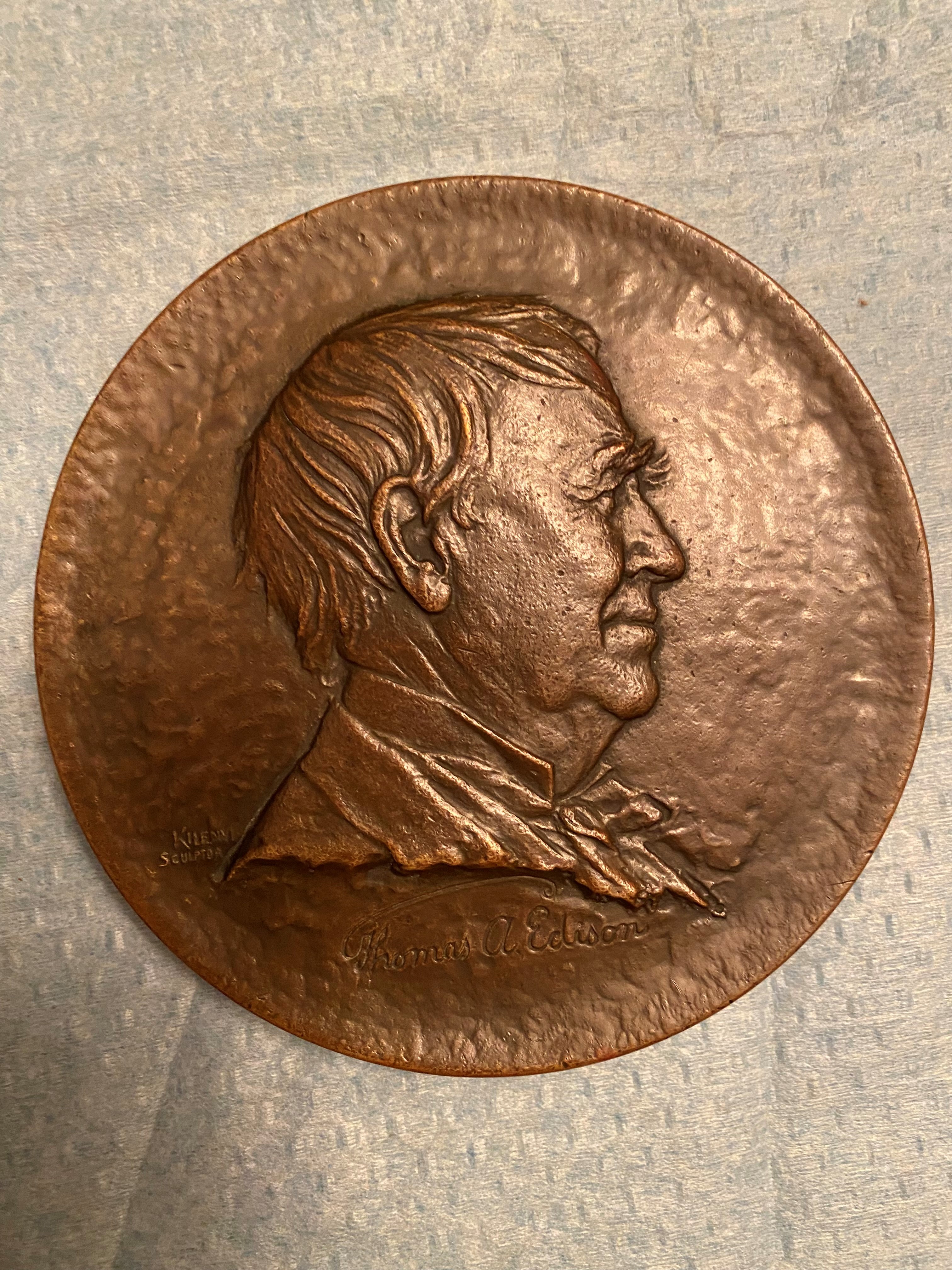 Below the words of tribute, as was the Whitehead and Hoag custom, the name of the company appeared. But more than merely saying Whitehead and Hoag Newark NJ, the medal said the following: “Fine Arts Department Whitehead and Hoag at Newark, NJ”. Whitehead and Hoag, never a company to miss a chance the showcase its capabilities, simultaneously honored the beloved inventor, the anniversary of the incandescent lamp and the craftsmen of the Fine Arts Department. The sculptor, Julio Kilenyi created the image of Edison.
