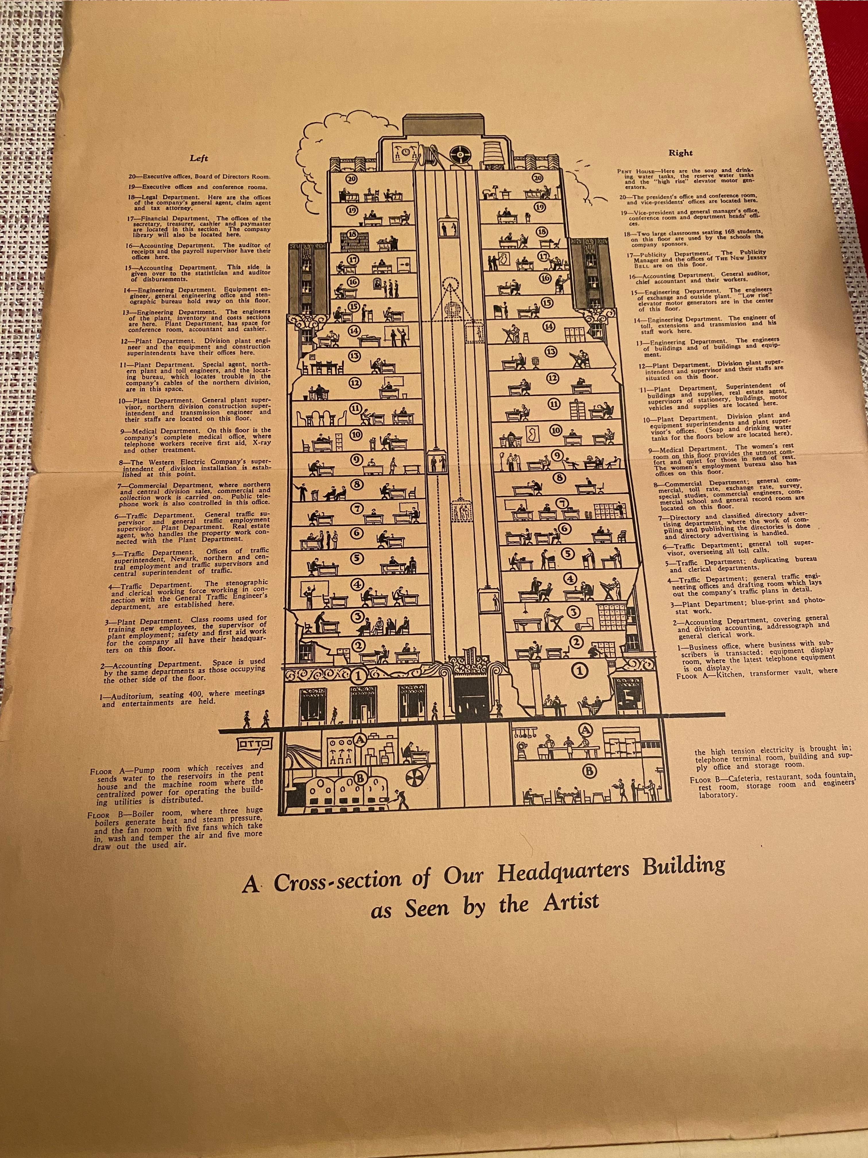 I have chosen a small collection of photographic excerpts , along with their original captions. This small grouping only reflects with the broadest brushstrokes the meticulous details of the New Jersey Bell magazine. No detail was omitted from the furnishings and decoration , employee amenities , including a medical suite and restaurant, to the heating and water systems. No detail was too small to receive attention. The corporate sense of progress and accomplishment was palpable. If there may be an area of particular interest, which wasn’t included here – ask. The details of the mechanical systems may be one such area – although not the only one. Enjoy the photos!