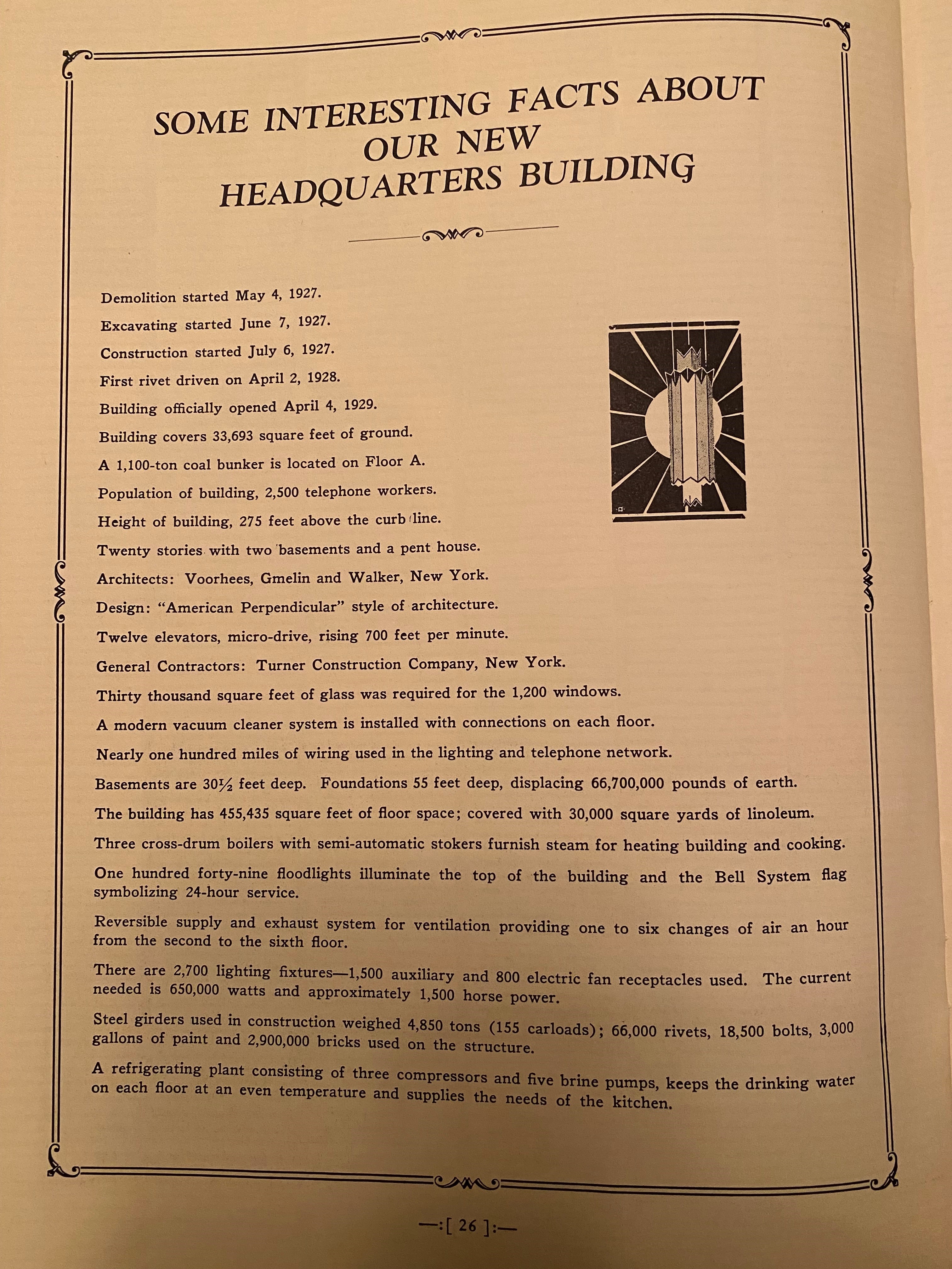 1929 – marked the fiftieth anniversary of the first telephone service in New Jersey . 1929 also marked the official opening of 540 Broad Street (April 4th) as the headquarters of New Jersey Bell organized in October 1927. To commemorate this important milestone, The New Jersey Bell Magazine dedicated the April 1929 issue as the “Building Issue”.