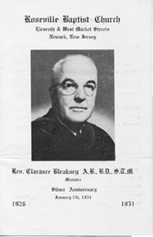 “The Rev. Clarance Bleakney was the full-time minister from 1926 until his retirement in the early 1960s. The Bleakneys lived across the street from the church at 12 Gould Avenue. Violet and Clarance had four children, Barbara, Joyce, Glenn, and Burton. Barbara and Joyce died of medical issues during their adult life. All were active in the Church. Mr. Bleakney was very active in visiting ill or shut-in members. He was for many years also Chaplin of the Newark Fire Department.